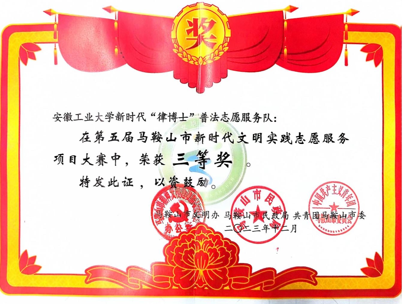 校级普法宣传平台,以青年力量进行法制宣传教育,不断增强普法宣传面及法治的渗透力,经过项目决赛角逐,“律博士”普法志愿服务队获马鞍山第五届新时代文明实践志愿服务项目大赛三等奖。