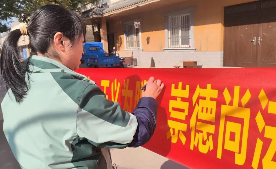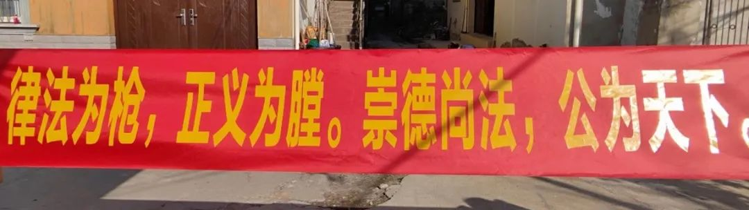下午2时,参与者们集结在村广场,活动组织者进行简要的活动说明,并分发宣传材料和签名笔。随后,以普法知识宣讲内容为主题的宣传横幅被展示在村广场,并吸引了众多村民的关注。横幅上“律法为枪,正义为膛”的口号掷地有声,“崇德尚法,公为天下”的正妹