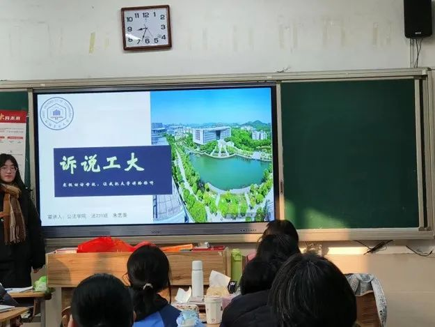 的环境优美宜人,照片上的四季美景和安工大的标志性“打卡点”引来了学弟学妹的阵阵欢呼声,讲台下有学妹发自肺腑地表示:“安工大的白桦林好美啊”。其次,我还向他们介绍我校优质齐全的硬件条件、新鲜可口且种类多样的饭菜、整洁宽敞且温馨的宿舍环境、完备先进的教学设施,学弟学妹看到一张张美食照片呈现在PPT上,不禁发出“哇塞”的感慨,我想他们是在感慨工大的美食“色香味俱全”啊。并且我通过一系列活动组图向无为中学的学弟学妹们介绍我校学子丰富多彩的课余生活,以此展现安工大学子阳光朝气的精神风貌。同时结合我自身当时面临的困难和茫然,指出他们现阶段学习过程中可能会产生的问题,并分享自己高三的经历和一些自己的学习见解。最后,表达对学弟学妹2024年高考大捷、金榜题名的祝福,也再次表示欢迎学弟学妹报考正妹