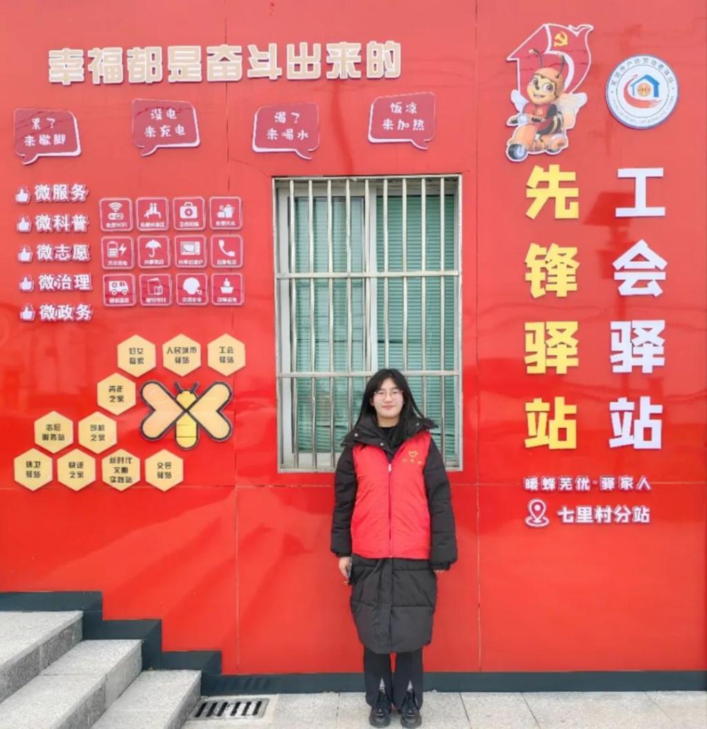 法231班朱艺美寒假回到家乡积极参与“无为市寒假大学生返家乡社会实践活动之‘暖蜂驿站’寒假青年志愿者”活动。1月22日,志愿者正式到岗——七里驿站,开展为期7天的暖蜂志愿活动。