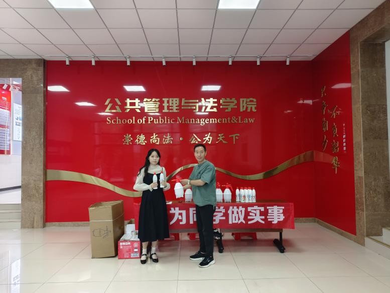各年级同学自觉排队领取防护物资,学院为大家准备的喷壶与消毒水,既便于日常使用,又能有效帮助同学们对寝室和学习环境进行清洁消毒。发放过程中,志愿者们认真维持秩序,细心叮嘱领取的同学:“要定期喷洒消毒,保持空气流通”“做好防护不仅是保护自己,也是守护身边的人”。一句句贴心的话语,让同学们在领取物资的同时,也感受到来自学院的关怀与温暖。学院党委副书记、纪委书记、学工院长周浩然亲临现场,对同学们表达了殷切关心。周浩然叮嘱同学们要增强防护意识,科学合理使用消毒物资,养成健康生活习惯,并强调学院将一如既往把学生的安全和健康放在首位,全力为大家营造良好的学习生活环境。