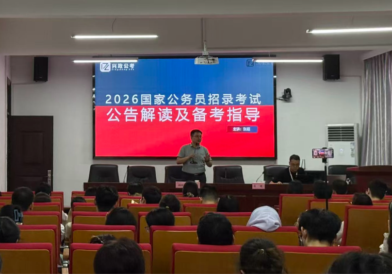 张超围绕2025年国考报考与备考方法展开宣讲:他展示了2026届应届毕业生公职日历,帮助同学们明确复习节点;从“国考公告、特点、报考指导、笔试备考”四维度深入解读;结合历年数据给出科学选岗策略,提醒同学们结合专业、兴趣、地域及竞争情况“精准报考”;还通过国省考对比,让同学们直观感受到不同考公类型的难易程度。