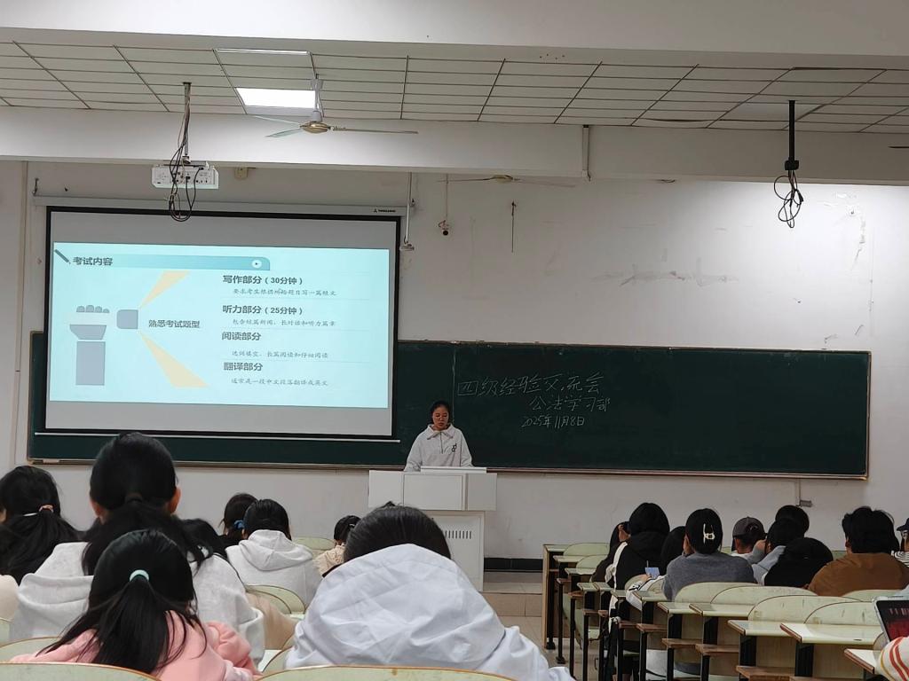 学习部于11月8日晚在第三教学楼南203教室开展四六级经验分享活动。此次活动特别邀请了程朵朵、梅啸云、江晨曦、宋子怡、陈志祥和高钰多位优秀公法学子来分享自己的备考经验和应试技巧。