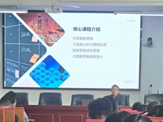 刘成教授围绕微专业课程体系、实践资源、就业适配方向展开讲解,结合案例展示数智营销的行业应用场景,互动环节学生提问积极,现场学术氛围活跃。刘成教授本次宣讲明确了微专业的发展历史和课程设置,他热情回答了同学们的问题,同学们也纷纷发表自己对“数智营销”这一专业问题的见解。