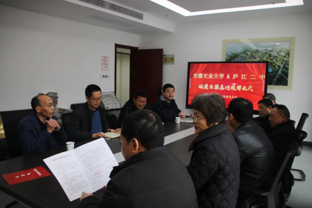一行。学院负责人及系室负责人与庐江中学、庐江第二中学校领导进行交流,送上2020~2021年度在我校就读的庐江中学和庐江第二中学校友喜报,分别与两个中学签订了合作协议,授牌“优质生源基地”,并就加强高中—大学衔接教育,携手提高人才培养质量等相关合作展开了深入交谈。