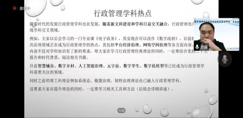 邀请到行政管理系优秀校友方錄于线上开展以“从适应到成长—行政管理专业学习之路”为题的专业思政建设讲座第一讲。方錄学长充分分享其专业学习的宝贵经验,以其自身经历体悟到大家的需求,并进行行政管理学科前沿及研究工具的汇报讲解。作为行政管理系学生,他从“提升专业学习兴趣、如何学好行政管理专业、如何提升自己全面发展”等方面为大家做了精彩讲演。他还积极敦促大家,在大学中要学会协调自己的生活、工作以及学习,要继续坚持奋斗才能拥有光明的前途与未来。