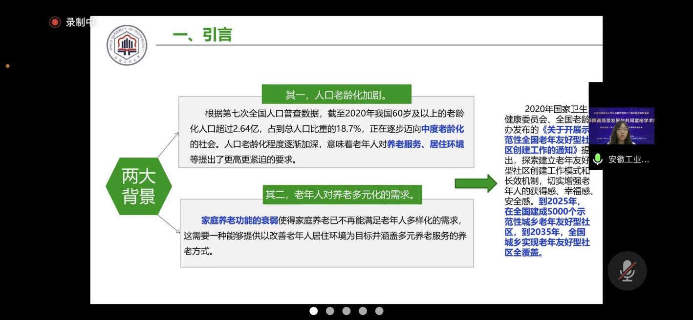 师生吴丽丽老师、方雪涵同学所作论文《老年友好社区:现实意义、发展困境及纾解路径》入选研讨会,该论文聚焦老年友好社区的建设背景、意义,并就当前发展中存在的困境提出对策。方雪涵同学的汇报受到了与会专家的良好评价,并提出了相应的改进意见。