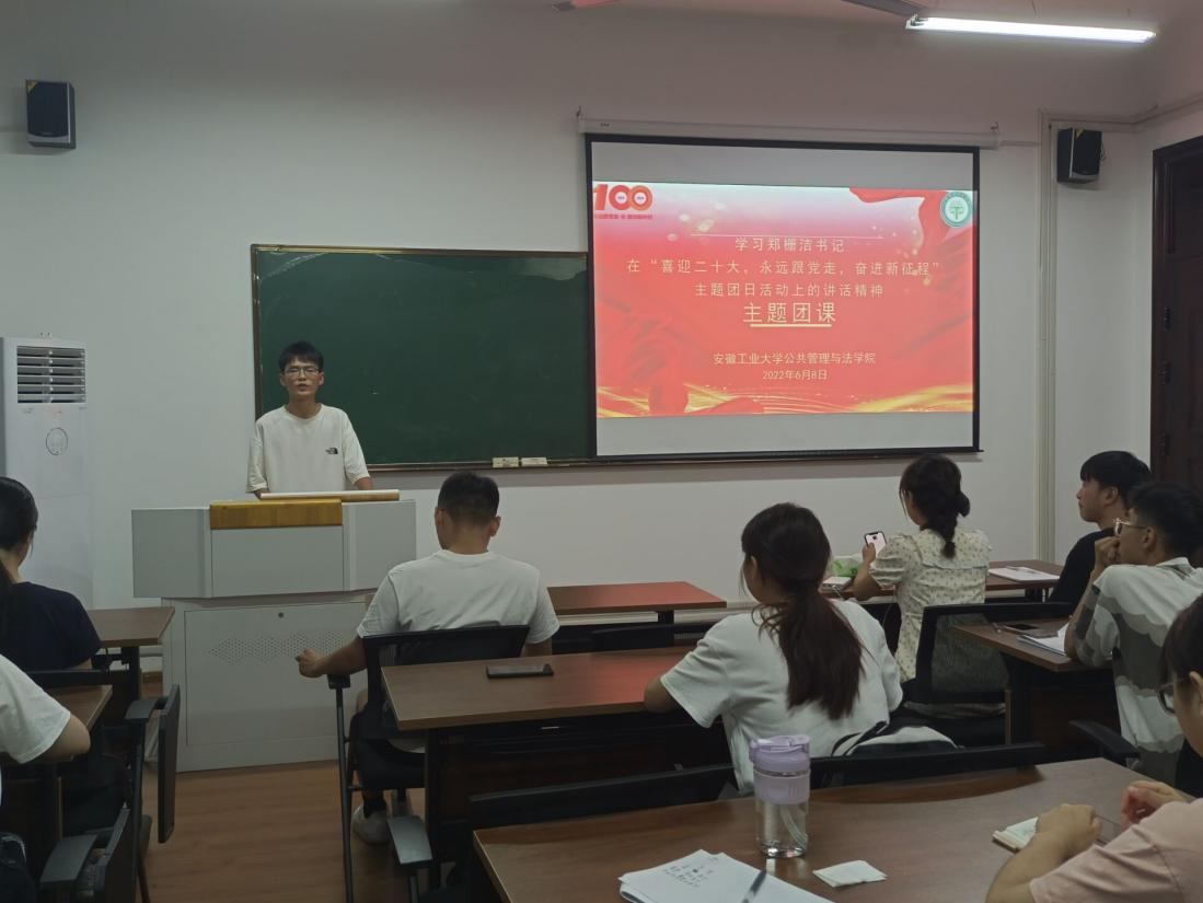 在课堂上,邢老师以“学思悟践勇担当,争当时代弄潮儿”为主题带领同学们学习郑栅洁书记的讲话内容,他说:我们青年学生应该学思悟践,学是学政治理论、党史团史,从共产党和共青团的百年奋进征程中汲取营养,化为动力;践就是要参与社会实践,进乡村走基层,在社会实践中坚定理想信念,提高自身素质。随后,5名学生代表上台分享了自己学习讲话精神的感悟。同学们一致认为:我们学院青年要积极奉献,加强理论武装和社会实践,在建设现代化美好安徽的征程中奉献自我。