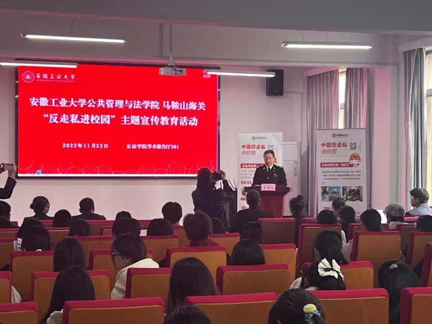 、马鞍山海关在公法楼学术会议中心联合举办“反走私进校园”主题宣传教育活动,守护“无私”的青春。马鞍山海关副关长吴钧、正妹