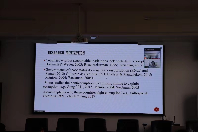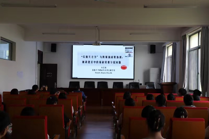 邀请,香港大学政治与公共行政学系朱江南教授以“反腐败关注力与跨领域政策协调:廉政建设中的稀缺资源分配问题”为主题,为学院师生带来了一场精彩的学术报告。报告采取线上线下相结合的方式,院长徐济益、副院长杨哲、王务均,学术交流中心主任虞维华等以及学院研究生和本科生线下聆听了报告。报告会由徐济益主持。