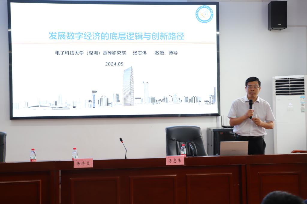 5月27日上午,电子科技大学(深圳)高等研究院院长汤志伟教授应邀来院作了题为“发展数字经济的底层逻辑和创新路径”的报告。院长徐济益主持报告会,副院长杨哲、王务均和部分青年教师参加本次活动,全体研究生、部分本科生以及两位博士校友聆听了报告。
