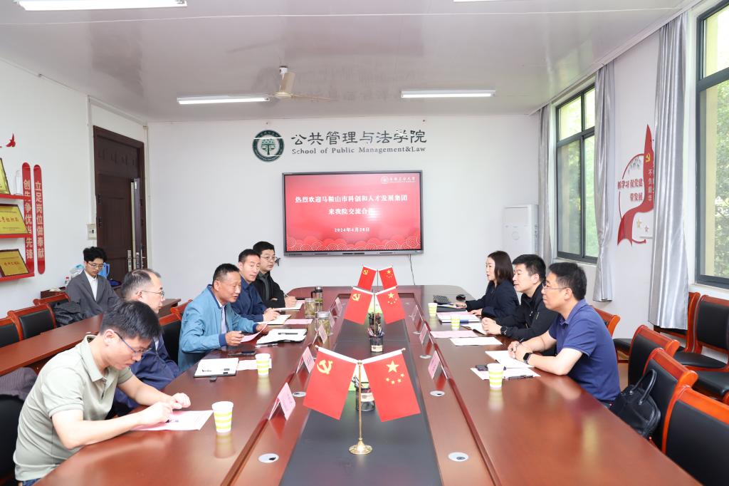 学院党委书记胡正友对马鞍山市科创和人才发展集团有限公司一行的到来表示欢迎,对马鞍山市科创和人才发展集团有限公司对学院工作的大力支持表示感谢,介绍了学院在学科建设、师资队伍、科技创新、人才培养等方面取得的成果,希望双方积极沟通交流,进一步探索校企合作新模式。靳杉董事长介绍了马鞍山市科创和人才发展集团有限公司的基本情况。许小娟重点介绍了公司在科创、人才服务和大学生实习实训等方面的业务情况。双方围绕党建联学共建、学生实习实践和就业创业、科技成果转化、人才服务、科创项目培育等方面开展了交流。