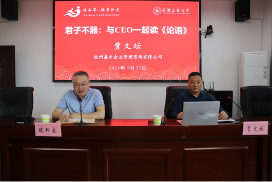 2004届校友、杭州嘉才企业管理咨询有限公司创始人兼CEO贾文坛应邀做客“佳山荟·读书沙龙”,为学院新文科人才培养创新班作了题为《君子不器:与CEO一起读<论语>》的报告。副院长王务均、创新班班主任韦子平和全体学员聆听报告。魏邦良教授主持报告会。